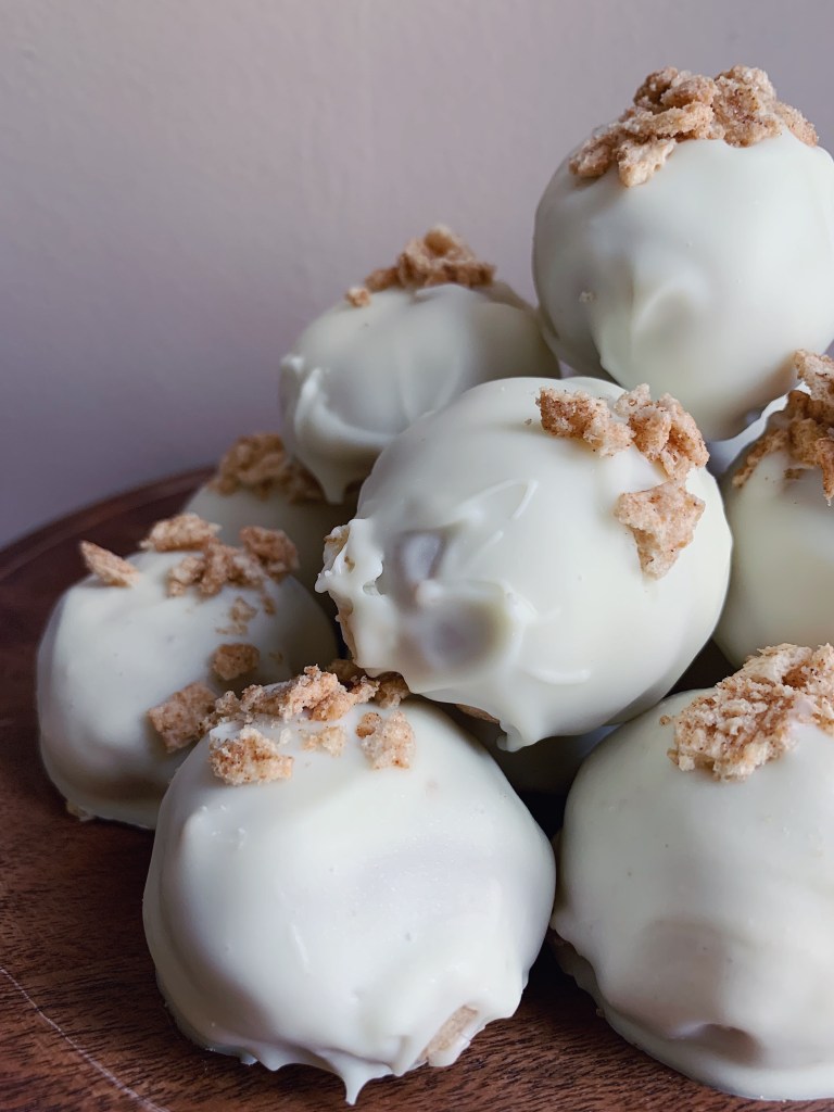 This was my first time making cake balls (which are basically just cake pops without the popsicle sticks), so I adapted my recipe from this Sally’s Baking Addiction recipe. I just swapped some of the flour for ground Cinnamon Toast Crunch, the regular milk for cereal milk and added some cinnamon and viola! You’ve got some deliciously made Cinnamon Toast Crunch cake balls.