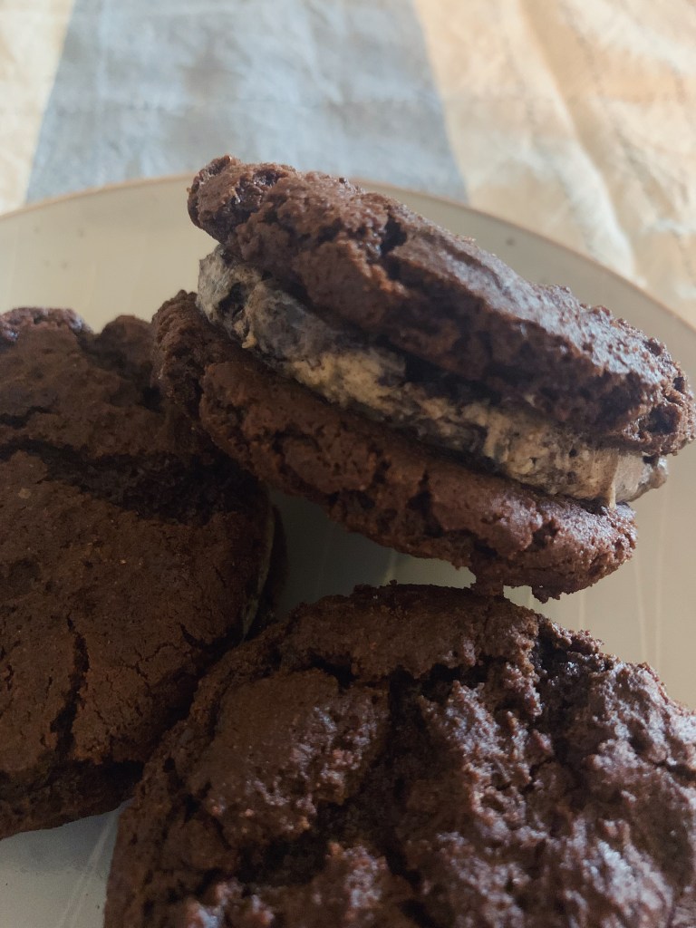- Once the cookies are cooled, separate the cookies into pairs with each bottom cookie turned upside down. Using a cookie scooper or spoon, scoop the filling onto the center of each bottom cookie and then press the top cookie onto the filling. Chill the cookie sandwiches in the refrigerator for 30-60 minutes to allow the filling to firm up a bit.