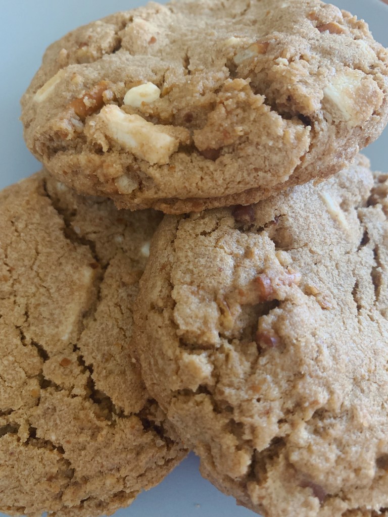 While I was at work the other day, my coworker offered me one of those long pretzel sticks covered in white chocolate. It had been a while since I had one, so I of course said yes and thoroughly enjoyed it. I enjoyed it so much in fact that it actually inspired me to make this Pretzel White Chocolate Cookie, as you can probably tell from the name.