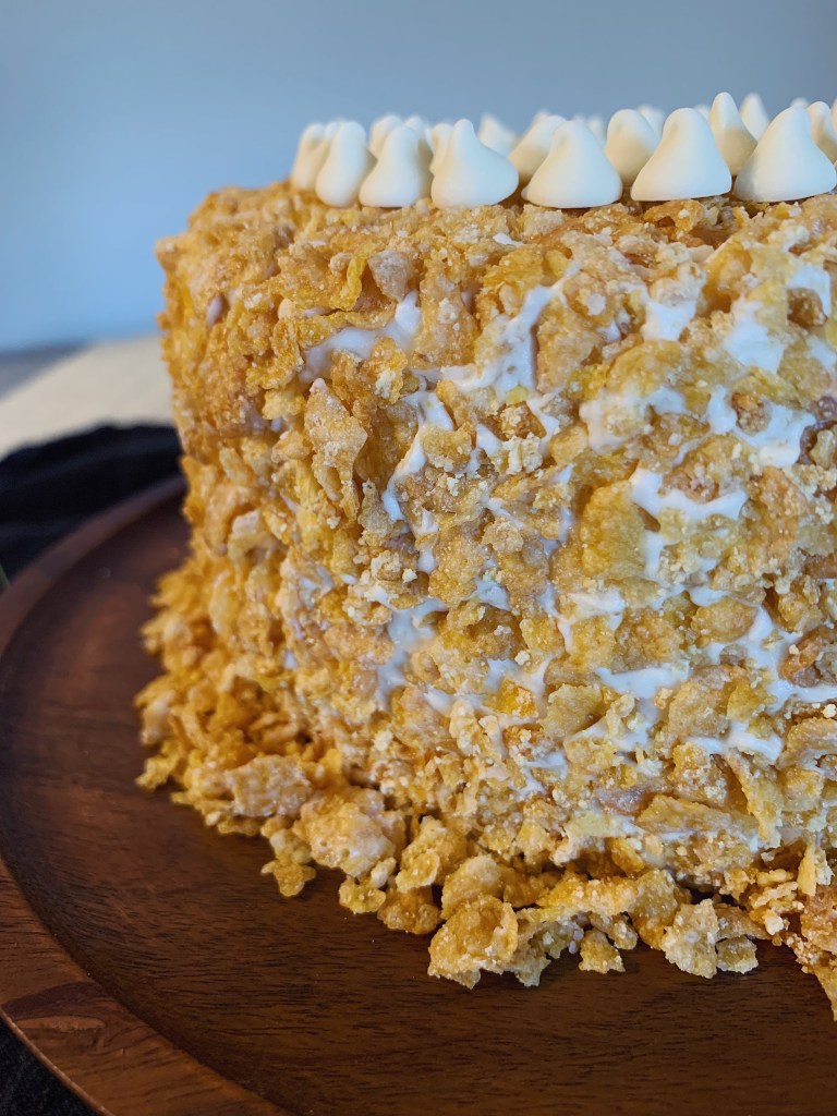 - Note: To decorate the cake like I did, I scooped a handful of Frosted Flake Crunch and then gently flattened my hand against the cake to get the Frosted Flake Crunch to stick to the sides. I repeated this process until the entire cake was covered; however, you can do as much or as little Crunch on the outside as you’d like!